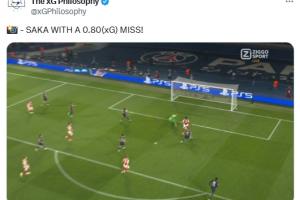 凌晨的欧冠半决赛次回合,第80分钟萨卡接传中获得面对空么的机会,但他的射门却没能将球打在门框范围内,错失了4分钟连扳两球的机会。据数据机构计算,萨卡这次射门的预期进球高达0.8。