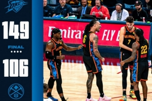 体育资讯5月8日讯 NBA季后赛首轮G2,雷霆主场149-106大胜掘金。