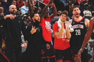 赛后火箭发布赢球海报,替补席庆祝瞬间成为封面,范弗里特、芬尼-史密斯、谢泼德和申京都入镜,还有一位火箭助教。
