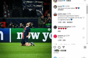 巴黎边锋克瓦拉茨赫利亚社媒晒照庆祝晋级决赛,并写道:“完全专注于你的计划。”
