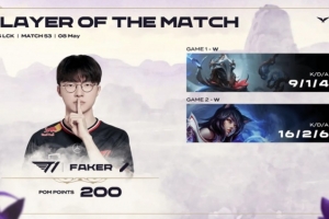 体育资讯5月8日讯 LCK常规赛T1以2-0横扫DRX,Faker两局合砍25/3/10的战绩,拿下本场系列赛的MVP。