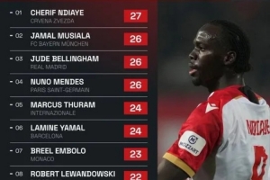 2.贾马尔-穆西亚拉(拜仁慕尼黑)— 26次