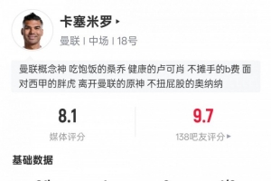 体育资讯5月9日讯 欧联杯半决赛次回合,曼联4-1毕尔巴鄂竞技。卡塞米罗首发出战,贡献1粒进球,送出7次抢断,还有3次解围,评分8.1。
