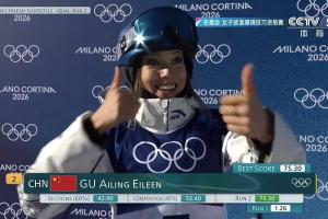 在首轮谷爱凌第二顺位出发,在落地时失去平衡摔倒。随后她坚持完成整套滑行,结束这一跳,得分1.26分。