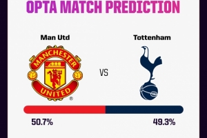 Opta超级计算机对决赛进行了10000次模拟,预测曼联胜率50.7%,热刺胜率49.3%。