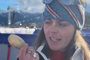体育资讯02月09日讯 布丽兹·约翰逊夺得米兰冬奥会高山滑雪女子滑降金牌,赛后布丽兹·约翰逊的金牌和绶带的连接处损坏。