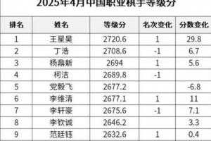 体育资讯5月9日讯 5月8日,中国围棋协会公布2025年4月中国职业棋手等级分,王星昊位居榜首,丁浩、杨鼎新位列二、三位,柯洁位列第四。