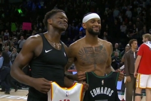 赛后,爱德华兹与前队友亚历山大-沃克互换球衣并合影。