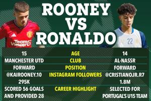 本周葡萄牙足协公布了新一期U15国家队的名单,C罗的儿子,效力于利雅得胜利青年队的克里斯蒂亚诺-多斯-桑托斯(迷你罗)入选。而C罗老队友鲁尼的儿子同样天赋异禀,《太阳报》将两人放在一起对比。
