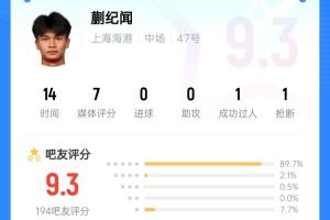 体育资讯05月09日讯 中超第12轮,上海海港3-1逆转青岛海牛,19岁的蒯纪闻本场比赛替补登场发挥亮眼,吧友给蒯纪闻打出9.3分的高分。