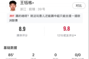 体育资讯5月10日讯 中超第12轮,浙江队客战山东泰山,王钰栋首发出战85分钟打入2球,获评8.9分。