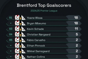 据Squawka数据统计,布伦特福德是本赛季英超唯一一支3名球员进球上双的球队,维萨、姆贝莫均打进18球,沙德打进11球。