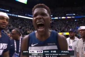 爱德华兹43分对卢卡38分的巨星对轰。两边此起彼伏的高潮。湖人下半场没有换人,五虎拼到结束。勒布朗打出生涯防守代表作的一节,然后最后一个传球失误一个犯规——犯规判定还是由芬奇教练挑战得来——森林狼击败湖人。