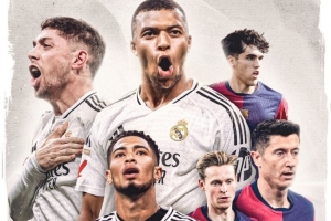 姆巴佩、贝林厄姆和巴尔韦德出镜,巴萨球员中,也有莱万、德容等人。海报上方为对阵双方以及比赛性质等信息,右下角为比赛体育场。