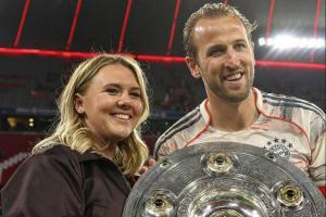 久未公开露面的凯恩妻子带着孩子们走入球场,而凯恩也当众给妻子一个热吻。