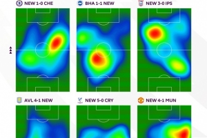 英超官方更新社媒动态,晒出托纳利近6场比赛的热图,称赞他的表现:“纽卡中场大师托纳利又一次不知疲倦的表现。”