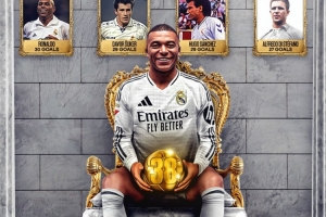 BR发海报祝贺姆巴佩登陆皇马首季即超越一众传奇,以首个赛季斩获38个进球成为队史首人。