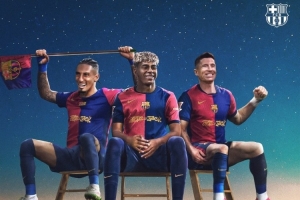 巴萨官方社媒晒出海报,庆祝国家德比取胜,内容为莱万、亚马尔、拉菲尼亚坐在云端。