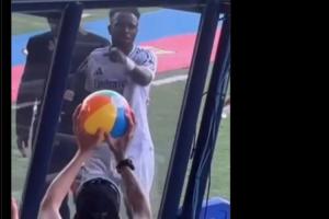 一名巴萨球迷手举着一个沙滩球,而维尼修斯愤怒的用手指着这名球迷。