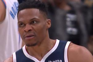 本场比赛,威少替补出战27分钟,12中2,三分9中2拿到6分3篮板1助攻1抢断6犯规,正负值-20。