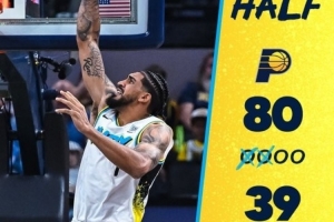 体育资讯5月12日讯 系列赛G4上半场,步行者主场80-39领先。