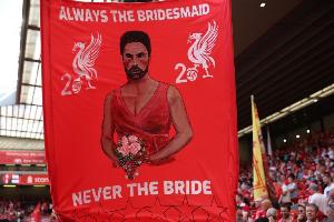 有利物浦球迷在看台上举了旗子,旗子上阿尔特塔被P成穿伴娘服手拿捧花。旗子上文字写着:总是伴娘,从不是新娘