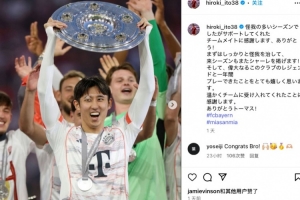 赛后伊藤洋辉更新社媒,晒出自己高举奖盘的照片,同时晒照向即将在赛季结束后离队的球队传奇托马斯-穆勒致意。