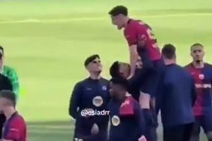 赛后庆祝时,阿劳霍直接把走过来的加维举高高,并指了指加维。