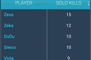 体育资讯5月12日讯 LCK常规赛单杀榜单更新,HLE上单Zeus以15次独占第一,HLE中单Zeka 12次第二,DuDu和Siwoo单杀10次,第五名的Vicla单杀9次。