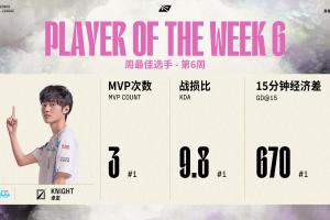 体育资讯5月12日讯 今日LPL赛事官方给出了第六周的MVP选手,BLG中单Knight状态回暖,凭借着第一的MVP次数、战损比、15分钟经济差成功当选。