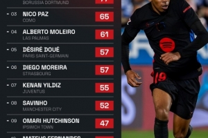 以下为本赛季五大联赛完成过人次数最多U21球员top10: