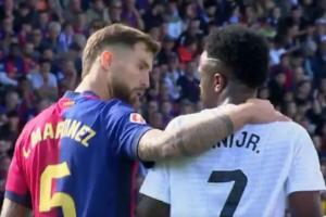 体育资讯05月13日讯 西班牙国家德比,巴萨主场4-3击败皇马。据转播画面显示,维尼修斯与伊尼戈-马丁内斯发生口角,维尼修斯还不忘嘲讽对手欧冠出局。