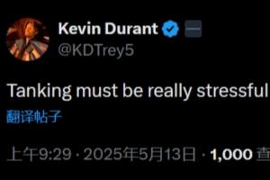 杜兰特有感而发,更新社交媒体写道:“摆烂对球队来说压力肯定挺大的吧...”
