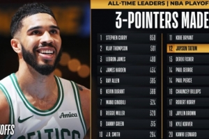 本场比赛过后,塔图姆(286)季后赛三分命中数超越费舍尔(285),上升至NBA历史第12位,排在他前面的是科比(292)。