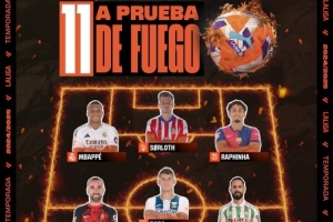 前锋:姆巴佩(皇马)、索尔洛特(马竞)、拉菲尼亚(巴萨)