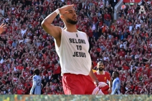 进球后的加克波激动脱掉上衣庆祝,露出打底内衣,上面显示英文:I BELONG TO JESUS(与主同行)。这一幕令人似曾相识,曾经的米兰王子卡卡也有类似标语的上衣。