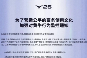 体育资讯5月13日讯 LCK官方发布了“加强对黄牛行为”的监控通知,禁止转让或转售门票、使用他人身份证件入场、代替他人购票(代抢票)、超过每人限购数量购买门票;