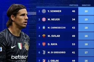 体育资讯5月14日讯 德国转会市场统计了本赛季五大联赛门将零封场次,并列出榜单,索默20场居首,诺伊尔19场第二。