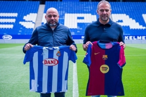 巴萨主帅弗里克、西班牙人主帅马诺洛-冈萨雷斯赛前见面,并互换两队球衣,巴萨官方社媒晒出两位教练的合照。