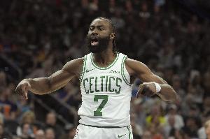 上半场,凯尔特人球星杰伦-布朗表现高效全面,打了21分钟11投7中,三分3中3拿到17分7篮板6助攻,正负值+6。