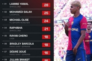 体育资讯5月15日讯 数据网站Squawka盘点了本赛季五大联赛通过运动战创造重大机会榜单,亚马尔28次居首,萨拉赫次席,具体如下: