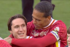 在赛后夺冠庆祝时,队长范迪克搂着基耶萨,与基耶萨聊天。
