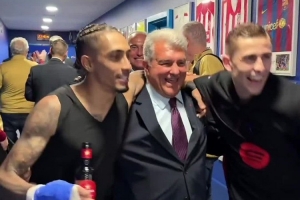 巴萨主席拉波尔塔赛后来到更衣室,与巴萨球员们一起庆祝斩获队史第28座西甲奖杯。