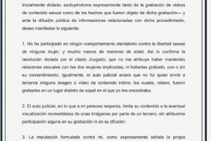 1-我从未参与过任何侵犯女性性自由的行为,更不用说未成年女性。这一点得到了上述法院文书的确认。该文书并未认定我与涉及的两名女性发生过性关系,也未认定我录制了这些视频。同样,还澄清了我没有向第三方发送任何包含私密内容的图像或视频,再次强调,这些视频是在我不在场的地方录制的。
