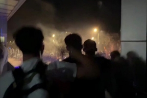 巴萨球员们在甘伯体育城的阳台上与球迷一起庆祝,并观看燃放的烟花。