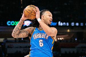 体育资讯5月16日讯 NBA季后赛西部半决赛G6,雷霆半场61-58领先掘金。