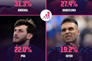 体育资讯4月28日讯 Opta超级计算机预测了欧冠四强球队夺冠的概率,阿森纳31.3%居首,巴萨27.4%次席。