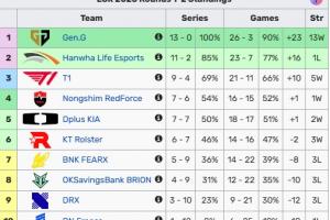 并且由于LCK第二轮每支队伍的一共有18场比赛,所以即使GEN后续全败战绩也会有13胜5负;而NS已经达到了6负,所以GEN已经锁定了LCK常规赛前三名。