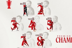 利物浦官方更新社媒动态,晒出全队球员的名单,配文:“英超冠军们!”