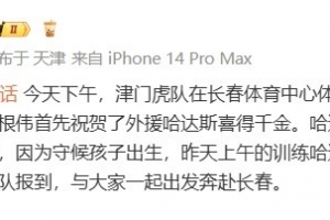 “今天下午,津门虎队在长春体育中心体育场适应场地训练的一开始,主教练于根伟首先祝贺了外援哈达斯喜得千金。哈达斯的二女儿,是昨天一早在天津出生的,因为守候孩子出生,昨天上午的训练哈达斯请假了,安顿好母女之后,中午就归队报到,与大家一起出发奔赴长春。”